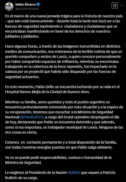 “Hace algunas horas, a través de las imágenes transmitidas en distintos medios de comunicación, nos enteramos de la terrible noticia de que un querido compañero y vecino de Lanús, a quien conozco personalmente por haber compartido espacios de militancia, mientras se encontraba trabajando en la cobertura de la feroz represión, fue impactado en la cabeza por un proyectil que habría sido disparado por las fuerzas de seguridad actuantes“, expuso.