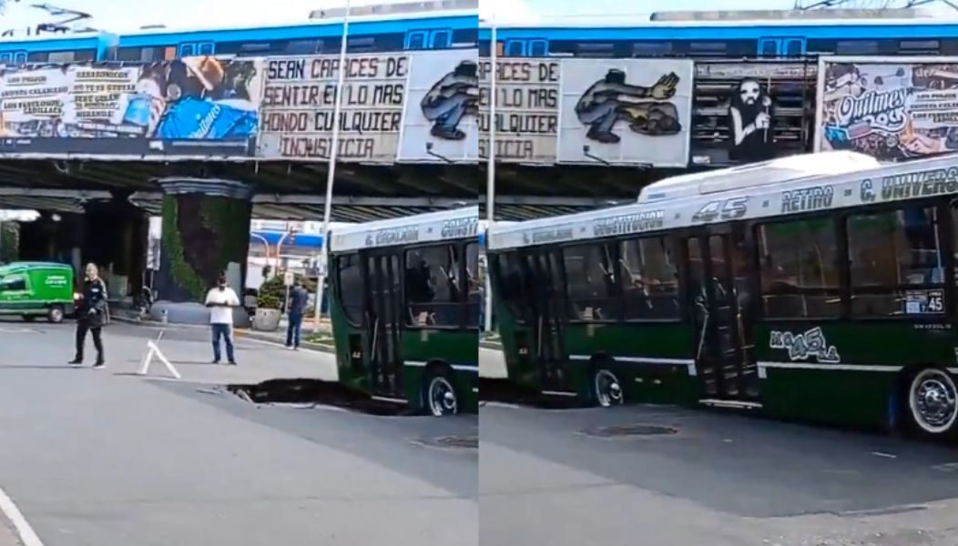 Un colectivo de la Línea 45 terminó hundido en el pavimento durante la tarde de este jueves en la Avenida Hipólito Yrigoyen (ex Pavón) durante la jornada de este jueves en la localidad de Avellaneda y quedó atrapado en el cráter, que aún permanece en esa zona.